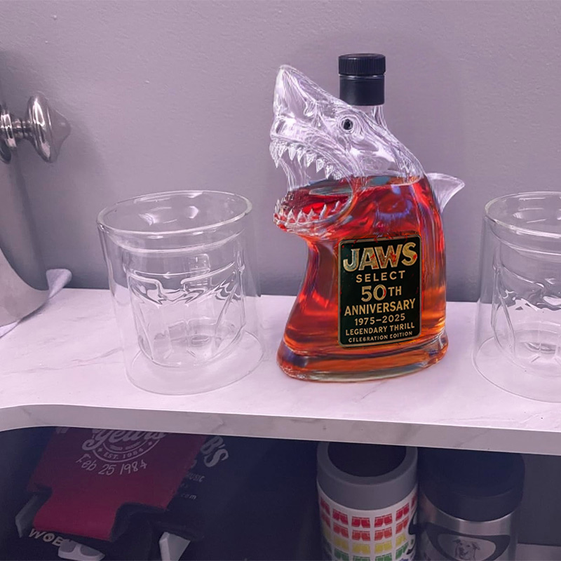 Crafted from crystal-clear glass and shaped like the great white’s fearsome head, this bottle isn’t just functional—it’s a showpiece. Set it on your shelf or bar, and watch how quickly it becomes a conversation starter.
